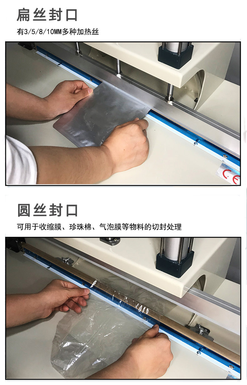 - 壓力裝置:包括壓合模具、氣缸等部件。在加熱封口時(shí),壓力裝置對熔融狀態(tài)的包裝材料施加適當(dāng)?shù)膲毫Γ狗饪谔幍陌b材料相互擠壓、融合在一起,形成牢固的封口。氣缸可用于提供穩(wěn)定的壓力源,壓合模具則決定了封口的形狀和尺寸。