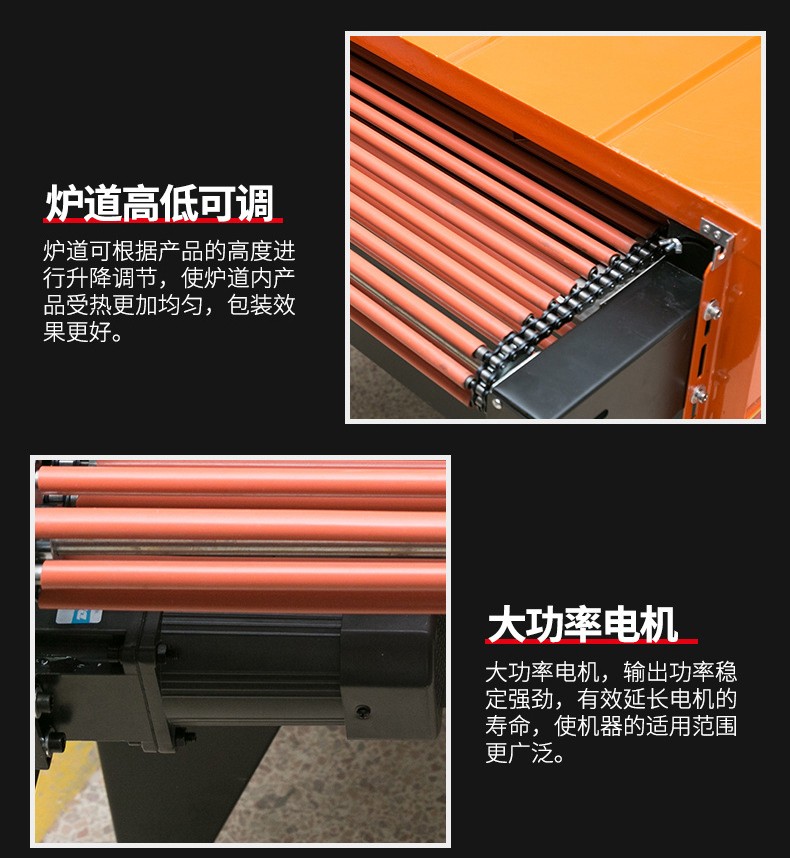 - 主要負責將被包裝的產品平穩地輸送通過加熱區域。通常是由輸送帶和驅動電機組成。輸送帶一般采用耐高溫、耐磨的材料,如橡膠或特殊的合成材料。驅動電機可以精確地控制輸送帶的速度,從而調整產品在加熱區域的停留時間,以適應不同產品和薄膜的收縮要求。例如,對于體積較大的產品,可能需要較慢的輸送速度,讓熱空氣有足夠的時間使薄膜充分收縮。