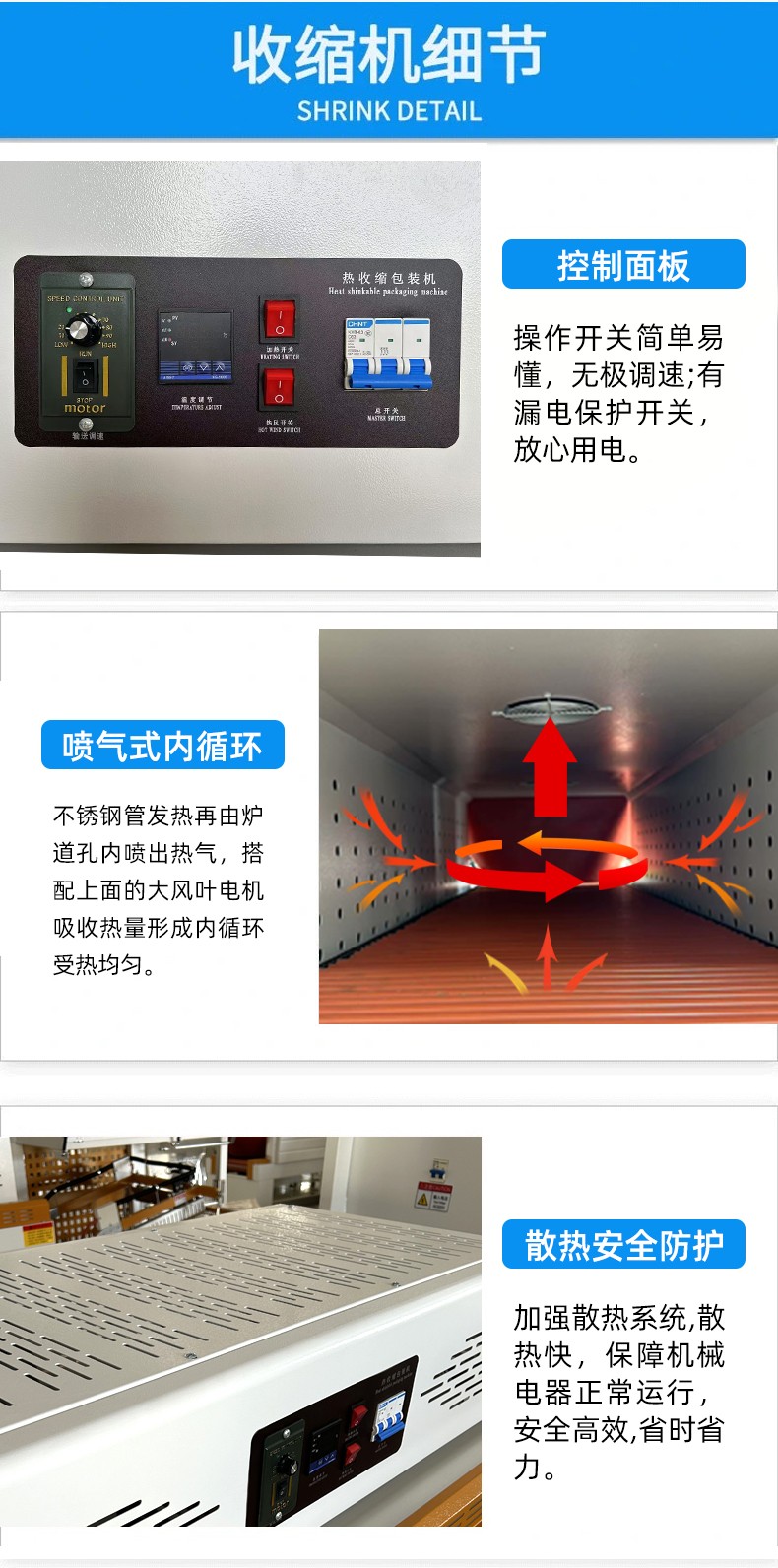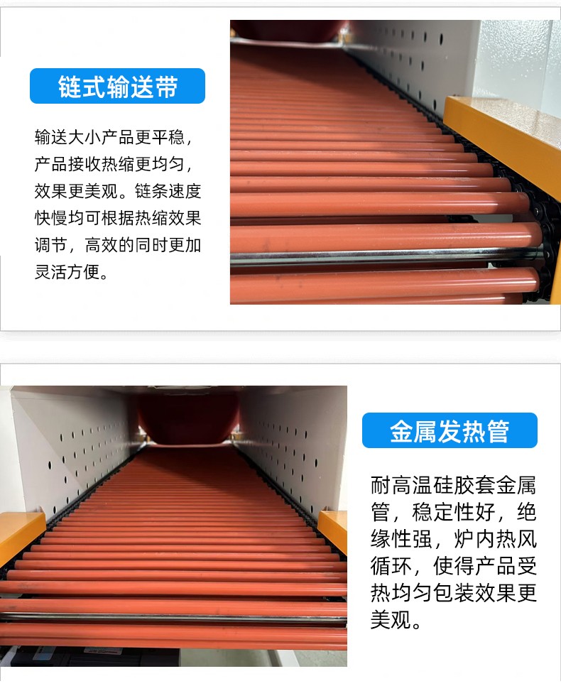 - 熱收縮系統(tǒng):由加熱爐、熱風(fēng)循環(huán)裝置、溫度控制系統(tǒng)等組成,提供均勻穩(wěn)定的熱量,使熱收縮膜達(dá)到理想的收縮效果。