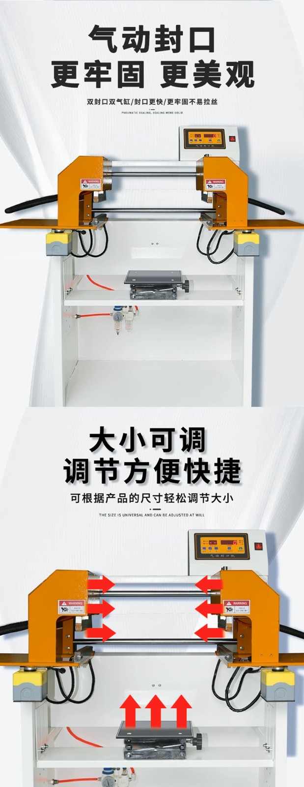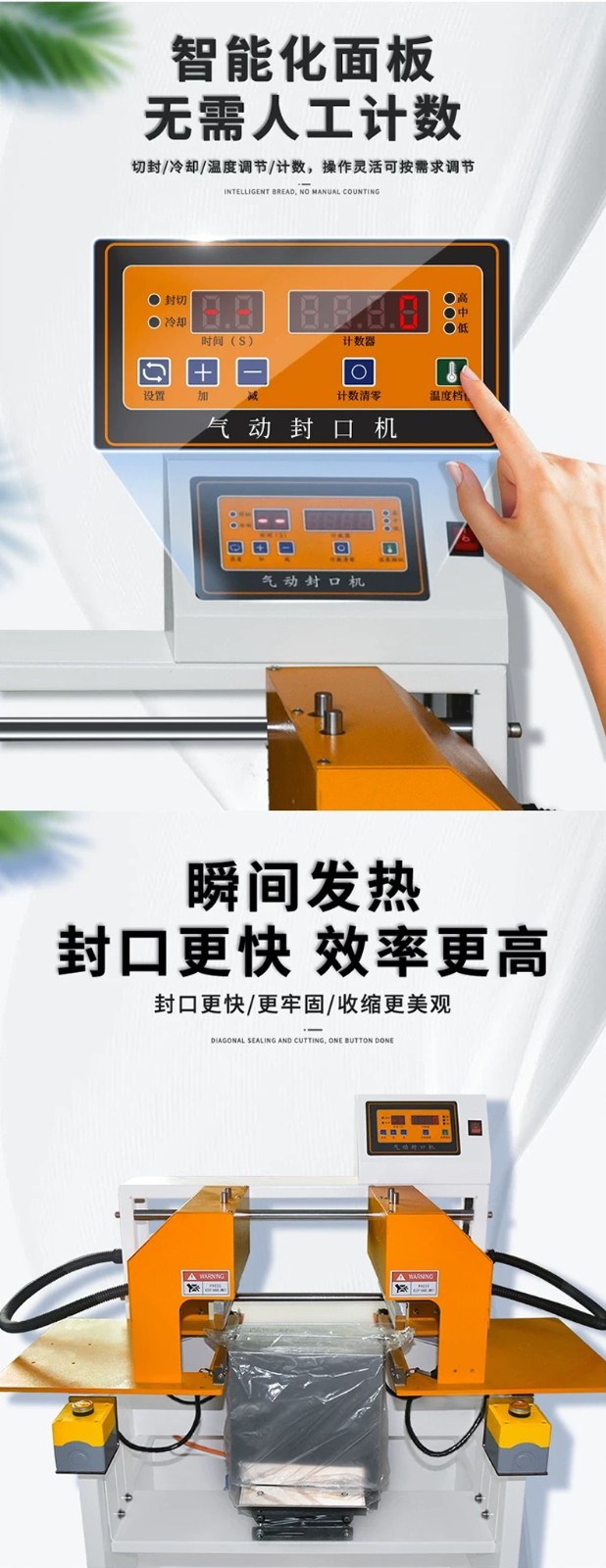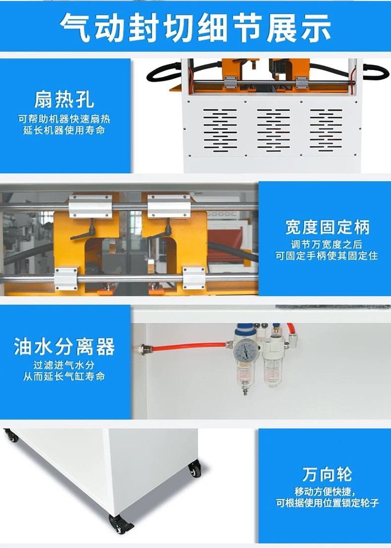 - 氣動(dòng)封口:利用壓縮空氣驅(qū)動(dòng)氣缸,帶動(dòng)封口部件運(yùn)作。電器脈沖技術(shù)使發(fā)熱元件發(fā)熱,在熱量和壓力共同作用下,實(shí)現(xiàn)包裝材料的封口。