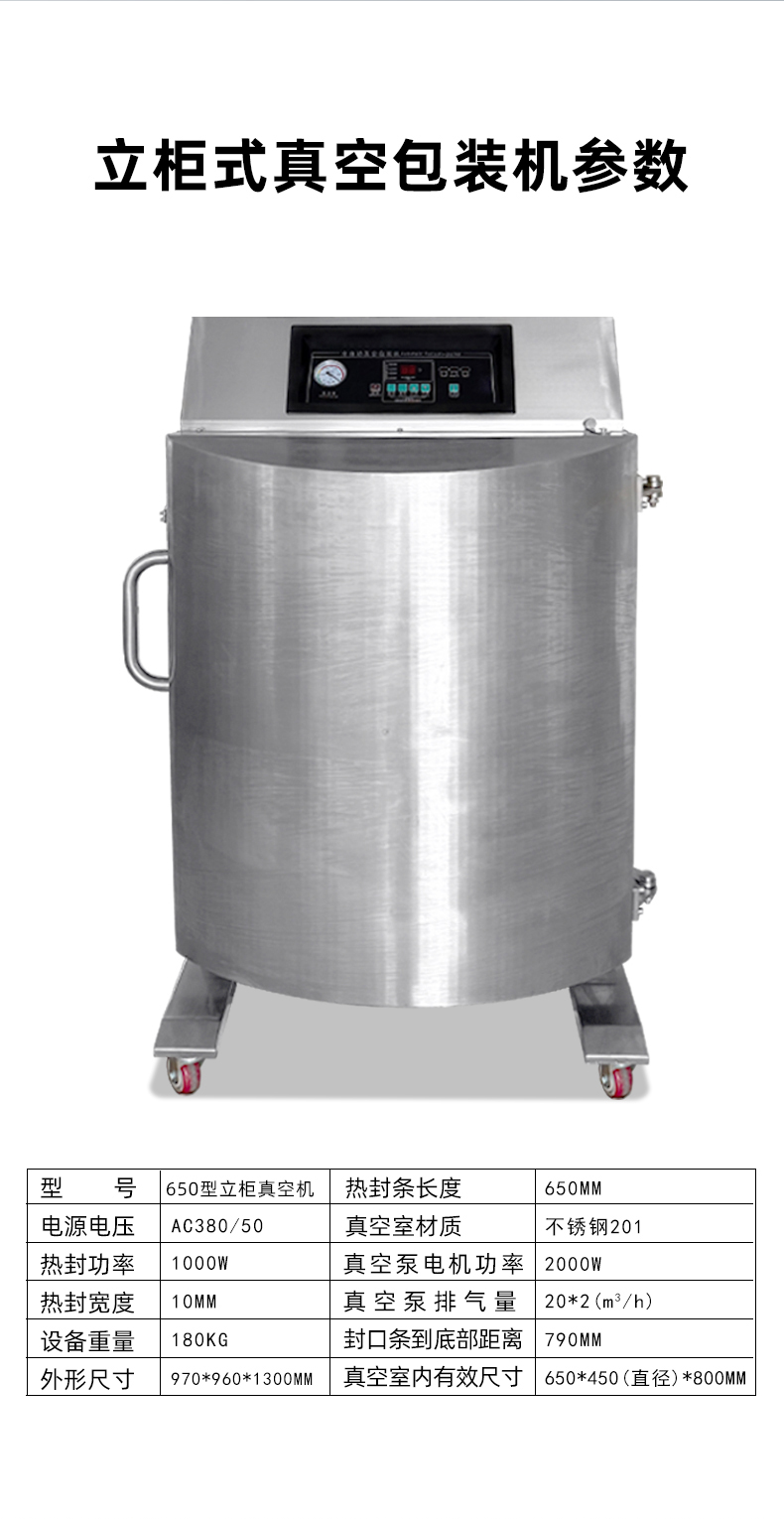 • 大容量真空室:立柜式真空包裝機的真空室容積較大,如 DZ-650L 型號,可同時處理大批量食材或大尺寸包裝,能滿足整只火腿、海鮮禮盒、大桶粉末顆粒等特殊形狀物品的封裝需求49