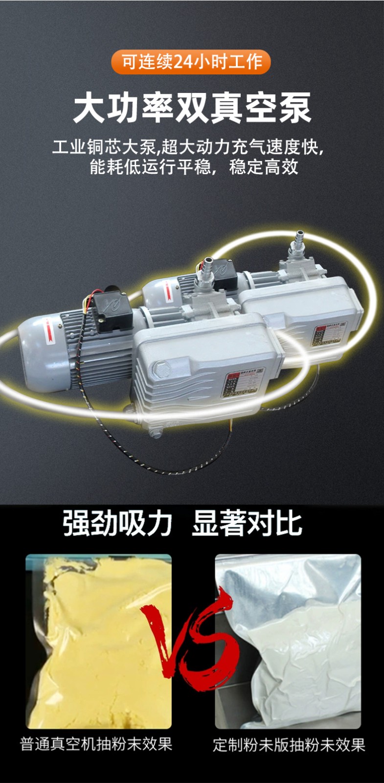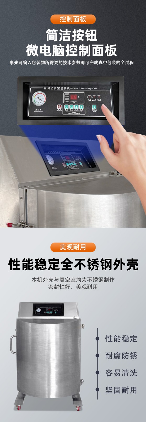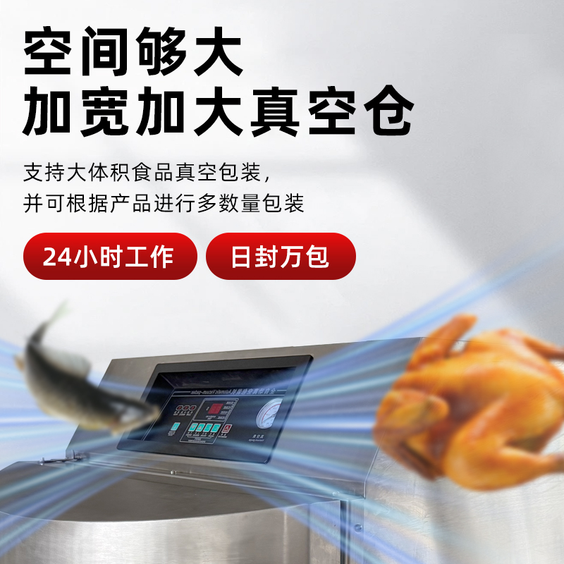 真空室:通常采用較大的腔體設計,多為豎立式,可容納大尺寸的包裝物品或多個小包裝同時進行包裝,部分還可將產品外包裝桶、紙箱等一起放入進行包裝。 封口裝置:一般為豎立式氣動封口,通過氣缸控制封口條,使包裝封口受力均勻,封口平直、美觀不起皺,封口尺寸多樣,常見的有 600mm、800mm 等。 控制系統:多采用 PLC 觸屏控制,可精確控制真空、加熱、冷卻時間,還能通過電接點真空表直接控制真空度,操作方便,穩定性強。 抽氣系統:配備高性能的真空泵,抽氣速度快,真空度高,部分機型還帶有過濾裝置,可防止粉末等雜質進