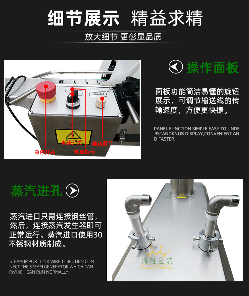 蒸汽式熱收縮機(jī)可以根據(jù)不同的生產(chǎn)速度來調(diào)節(jié)設(shè)備功率的大小,輸送帶采用無級調(diào)速,輸送速度可以任意調(diào)節(jié)。廣泛應(yīng)用于大桶或小瓶裝礦泉水、純凈水;汽水和茶飲料等食品飲料行業(yè),以及化妝品、洗發(fā)水和五金電子等需要收縮膜包裝的場合使用