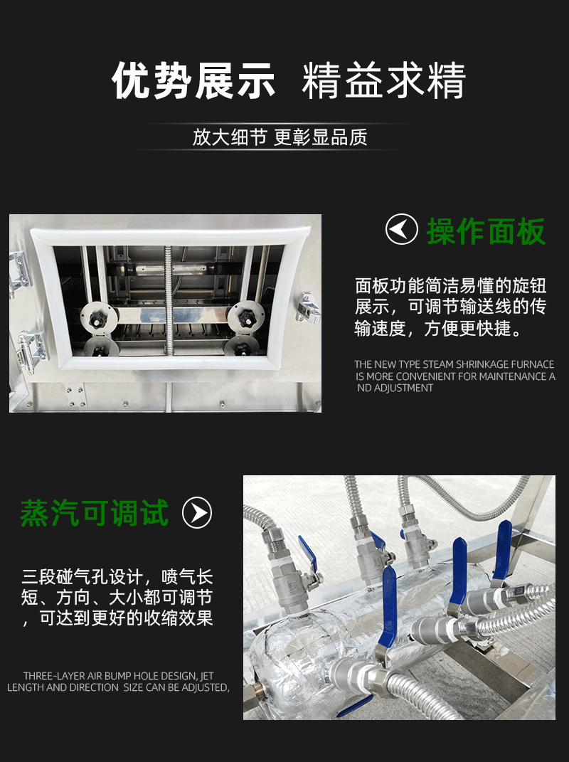 蒸汽收縮機(jī)是新一代收縮膜機(jī),設(shè)計(jì)精巧, 外型美觀,不占空間,移動(dòng),安裝迅速快捷,超大范圍的調(diào)節(jié),使其可適用于各種輸送帶和滑道。