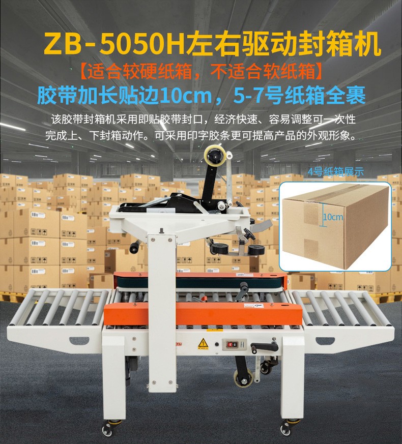 輕巧耐用,操作簡單;側面皮帶驅動,適用較窄紙箱;上下皮帶驅動,適用于較高紙箱;封箱機節省勞動力,減少開箱現象。連線使用可配套折蓋封箱機,單臺使用可選用半自動封箱機。
